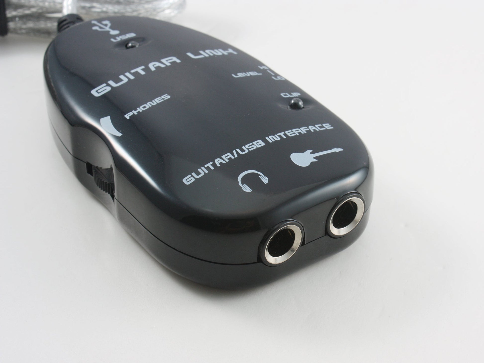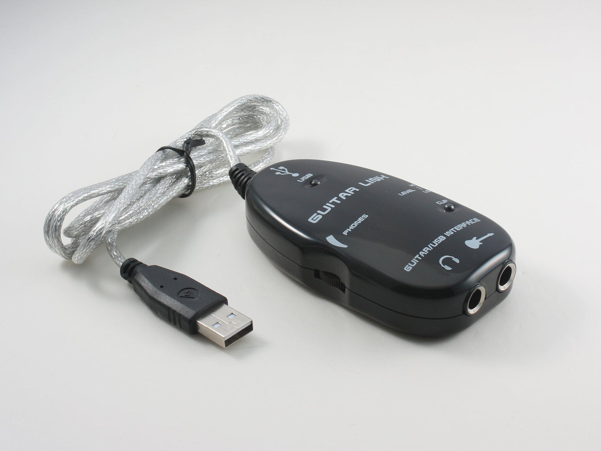 Konvertiert AUX-Signale einer eingesteckten E-Gitarre zu USB-Signalen und bietet damit ein simples USB-Audio-Interface.