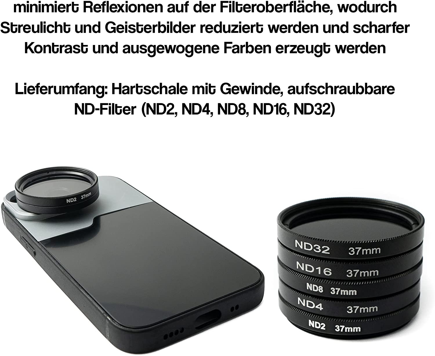 Lieferumfang: Hartschale mit Gewinde, aufschraubbare ND-Filter (ND2, ND4, ND8, ND16, ND32)