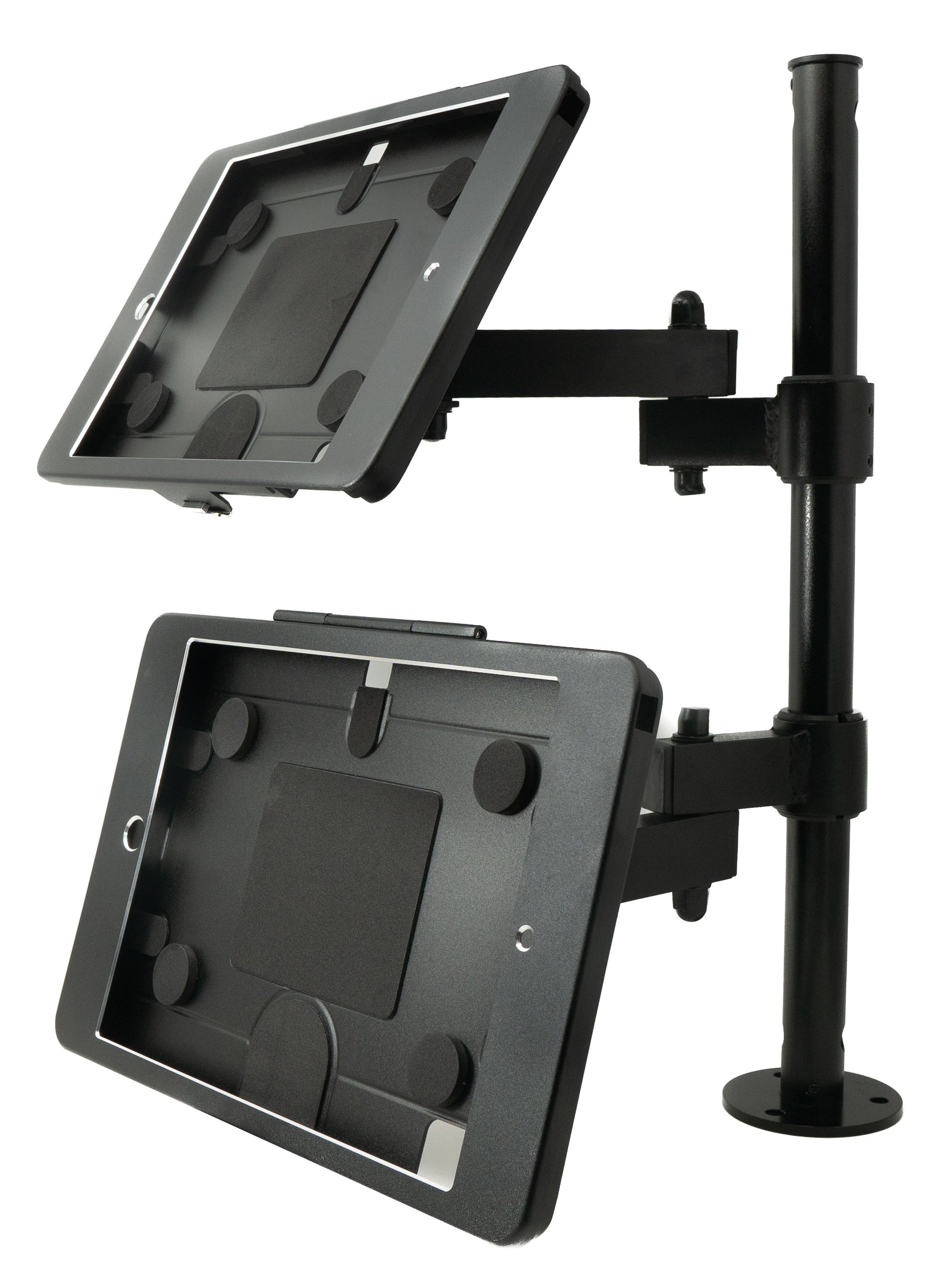 Diese Dual-Tischhalterung von SYSTEM-S bietet eine ideale Lösung für die effiziente und sichere Präsentation von zwei iPads gleichzeitig, perfekt geeignet für professionelle Umgebungen wie Messen, Ausstellungen und Geschäfte.